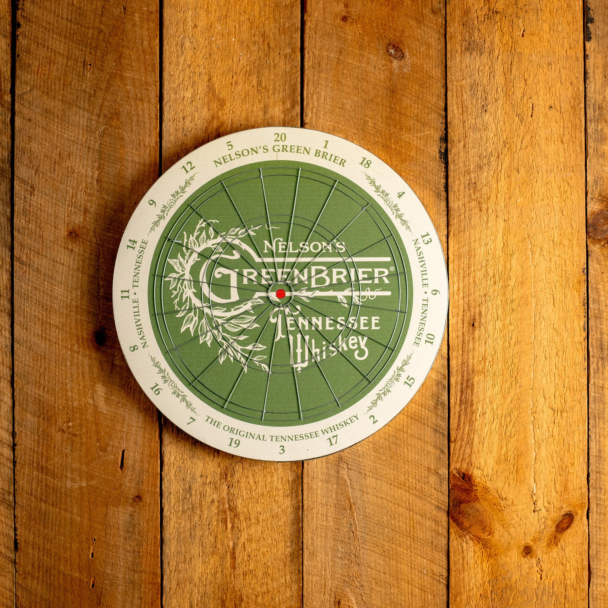 This set includes an 18" professional tournament-grade cork dartboard, three brass darts with custom Nelson’s designs, and six additional brass darts with classic flags. The board has a silver metal grid on the board surface and a silver metal ring around the circumference.